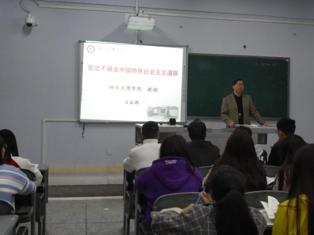2018年11月12日晚,学校校长、四川省有突出贡献的优秀专家刁永锋教授在一教楼208教室为财经管理学院2017级1、2、8班同学讲授题为“坚定不移走中国特色社会主义道路”的形势与政策课。财经管理学院党总支副书记(主持工作)李兴贵老师、网投十大信誉可靠平台形势与政策教研室主任梁云老师、辅导员魏晓军老师一同聆听了刁校长的授课。