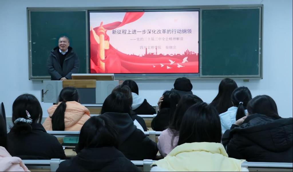 为引导广大师生将思想和行动统一到党的二十届三中全会精神上来,进一步激发青年学生昂扬斗志,勇担时代使命,12月16日,学校党委副书记徐晓宗教授在莲湖东区B110教室,以《新征程上进一步深化改革的行动纲领——党的二十届三中全会精神解读》为题,为政法学院知识产权学院全体辅导员及部分学生讲授形势与政策课