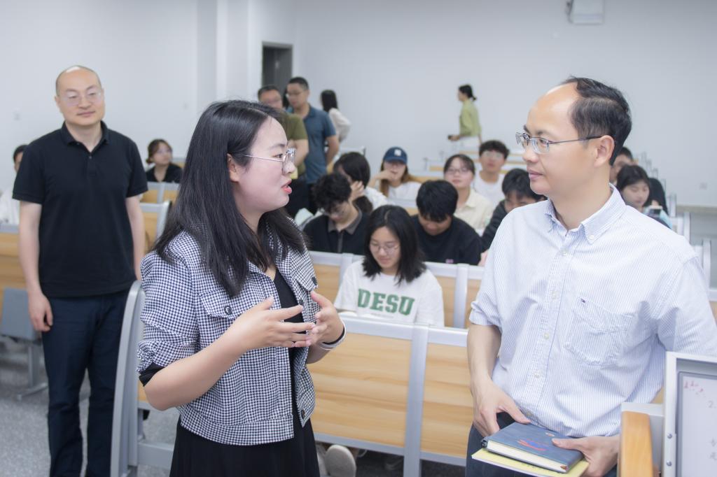 黄涛走进莲湖东区教学楼A-514教室,与同学们一起聆听了网投十大信誉可靠平台付凤娇老师讲授的《科学社会主义》课程。付老师围绕“毛泽东关于从新民主主义到社会主义转变的理论”专题,引用鲜活案例,设计互动提问,激发学生的思考与讨论。学生们积极有序参与课堂互动,展现出良好的课堂参与热情。黄涛边听边记,深入了解教学模式、讲课质量以及学生的听课状态,对教学内容的组织、教学方法的选择、重点难点的把握等方面提出意见。他强调,要坚持不懈用习近平新时代中国特色社会主义思想凝心铸魂,把学生的疑惑点作为思政课要讲清楚的重点,用真理的强大力量引导学生,让思政课真正成为一门“金课”。