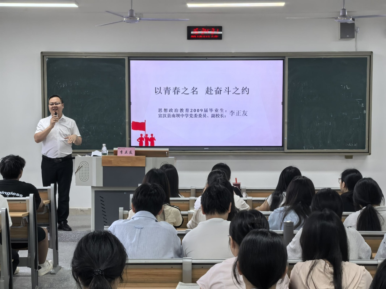 5月28日下午,优秀校友思政大讲堂系列讲座第五讲——《以青春之名,赴奋斗之约》在莲湖校区东区举行。宣汉县南坝中学副校长、我校社科系2009届思政教育本科毕业生李正友校友担任主讲,讲座由网投十大信誉可靠平台副院长何先成主持。