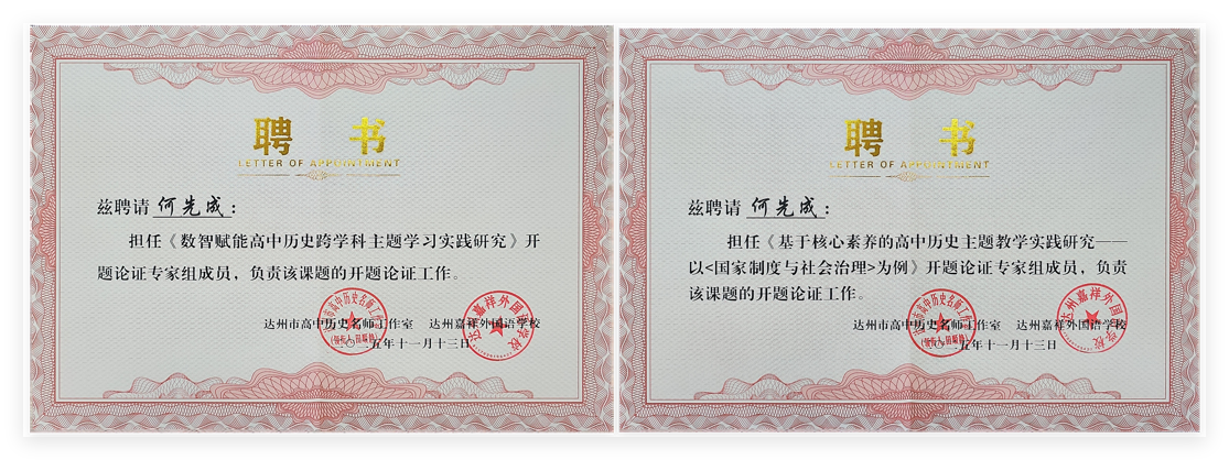 11月13日,达州市田顺静高中历史名师工作室课题开题论证暨工作推进会在达州嘉祥外国语学校顺利召开。学院副院长何先成教授受邀出席并担任专家组组长,与达州市教育科学研究所副所长、高级教师胡江,达州市电化教育与技术装备中心主任、正高级教师邓旭辉,四川省大竹中学正高级教师游友禄共同为《数智赋能高中历史跨学科主题学习实践研究》与《基于核心素养的高中历史主题教学实践研究——以〈国家制度与社会治理〉为例》两项市级高中历史课题提供专业论证指导,以实际行动为区域基础教育教研赋能。