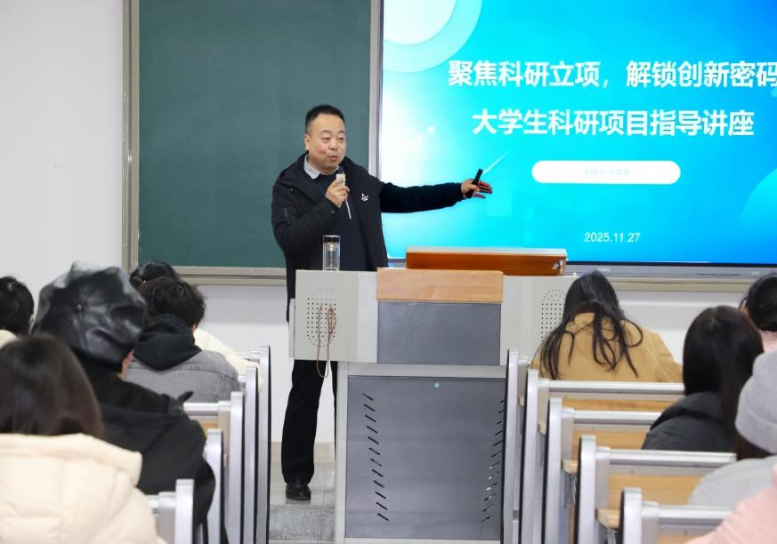 为提升学生科研素养,激发创新思维,助力学子在学术道路上稳步前行, 11月27日下午,网投十大信誉可靠平台组织开展以“聚焦科研立项,解锁创新密码”为主题的大学生科研项目素养讲座,本次讲座由副研究员马建堂老师主讲,2024级、2025级全体同学参与。
