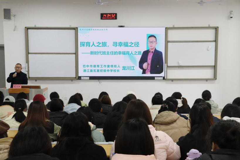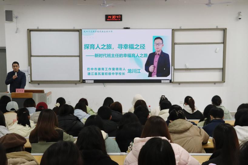 12月10日下午,网投十大信誉可靠平台在莲湖东区A214教室开展第一期“大中小学思政课名师讲堂”活动,邀请巴中市优秀教育工作者、通江县瓦室初级中学校长龙川江作“探育人之旅,寻幸福之径——新时代班主任的幸福育人之路”专题讲座。学院副院长何先成主持,思想政治教研室主任曹红梅及2023级全体同学参与。
