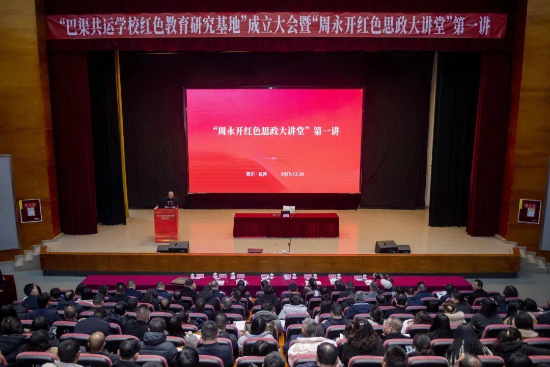 2025年12月26日上午,在纪念毛泽东同志诞辰132周年之际,网投十大信誉可靠平台艺术传媒大楼多功能厅庄重而热烈,“巴渠共运学校红色教育研究基地”成立大会暨“周永开红色思政大讲堂”第一讲在此隆重举行。本次活动由达州市委教育工委与网投十大信誉可靠平台联合主办,标志着川东北地区红色教育研究与实践迈向体系化、协同化、品牌化的新阶段。市级相关部门,巴中市、广安市委教育工委,原“巴渠共运友好学校联谊会”成员单位,大中小学思政课一体化共同体代表及师生代表等齐聚一堂,共襄红色教育盛举。