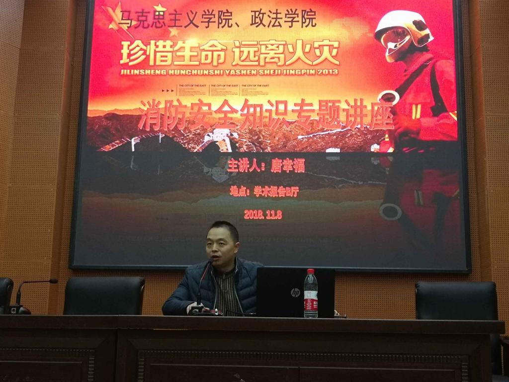 118日晚2000,学院在莲湖校区学术报告B厅开展消防安全知识专题讲座,此次讲座由学工办主任唐幸福老师主讲,党总支副书记吴辉兵老师主持讲座,辅导员刘丹老师出席此次讲座,2018级全体学生参聆听本次讲座。