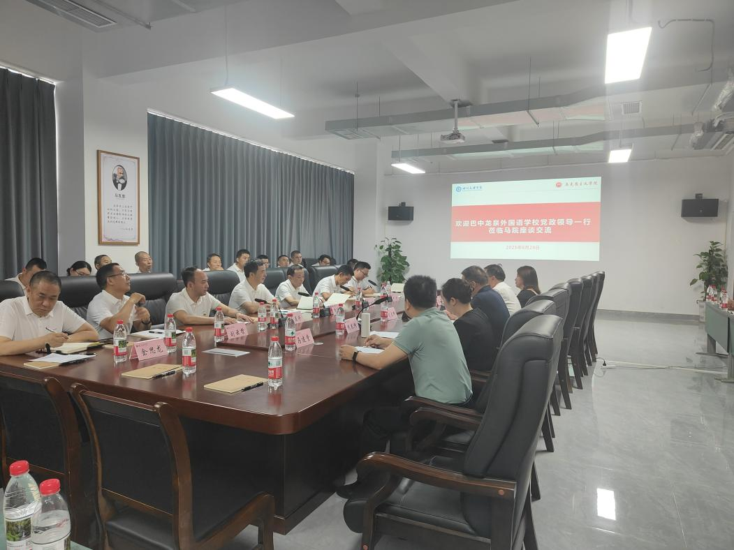 院长孙杰对巴中龙泉外国语学院党政领导一行的到来表示热烈欢迎。他指出,巴中、达州作为川陕苏区的腹地,红色文化资源富集,在红色文化育人合作方面具有广阔的前景。两校办学历史相似,都经历了艰苦创基业的岁月,都秉承着为党育人、为国育才的初心和使命,双方也彼此输送了大量人才,增进了相互联系,今后应继续加强各领域的交流合作、推动高等教育与基础教育的共同发展。