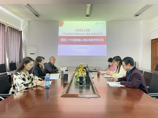 为全面贯彻党的二十大精神,推进习近平新时代中国特色社会主义思想“三进”的思想性、理论性和针对性,毛泽东思想和中国特色社会主义理论体系概论课教研室于411日在博文楼611会议室开展集体备课活动,主题:党的二十大精神融入概论课教学研讨会,教研室主任王维老师主持会议,教研室全体成员参会。