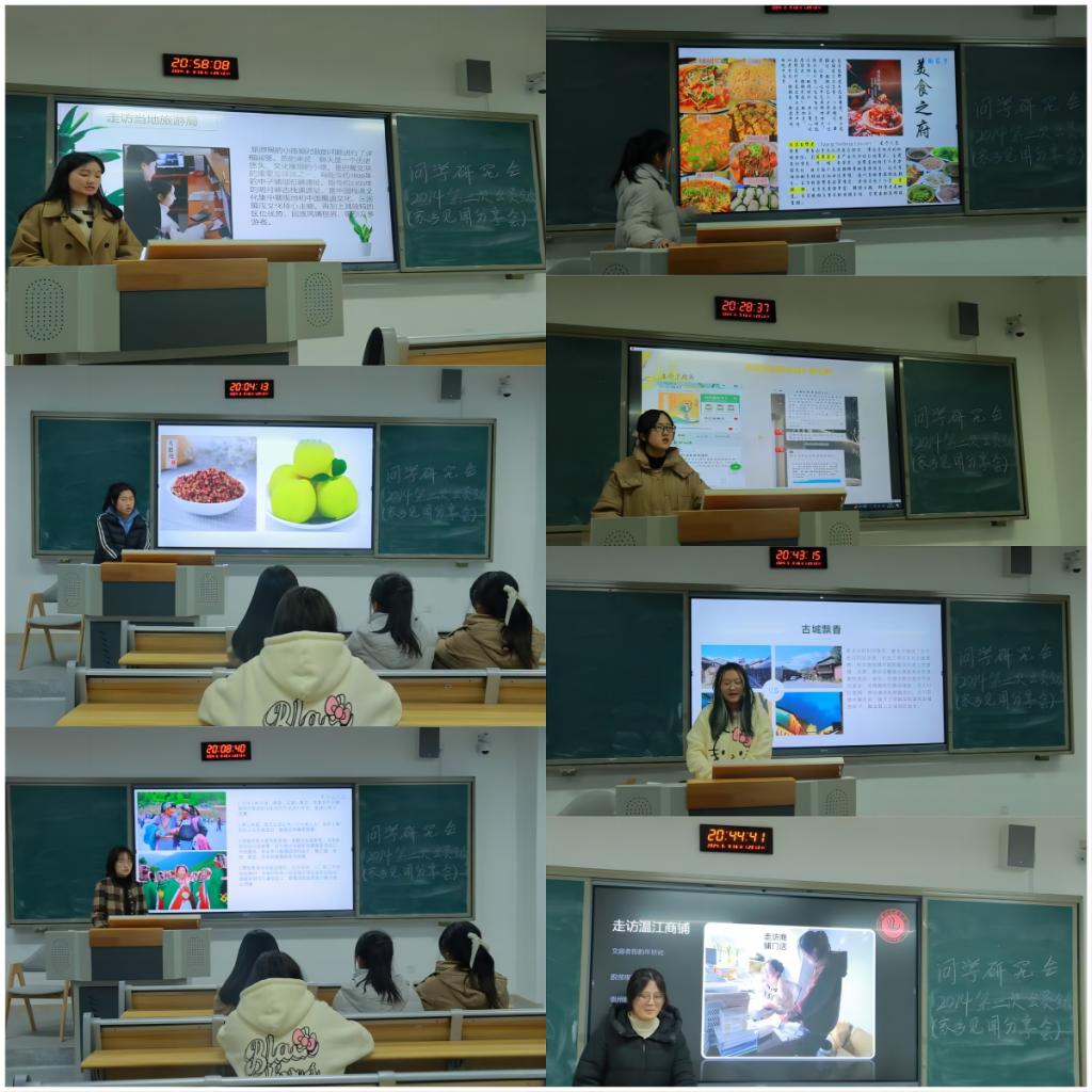 首先,社团成员分别汇报了各自的家乡见闻。团支书罗永倩对家乡见闻活动的总体情况做了简单的总结,介绍了自己的家乡的特产及风俗舞蹈,社团负责人杨镧介绍了小金的自然风光、实地调研后对服饰文化的总结,会员张宇欣同学介绍了家乡自贡的城市发展及社区周边的变化,巫华群同学介绍了家乡人才现状及宗族祠堂的发展,张沁同学介绍了西昌邛海及古镇的现状,吴星润同学介绍家乡城市变化及政策对农村的影响,梅寒香同学回家乡探析朝天旅游城市发展的原因。本次活动共有15名同学参加并提交见闻心得体会,共考察实践近20个县城、村镇、社区,如:重庆、朝天、阿坝州、自贡、温江。每一位同学对自己的家乡见闻都有深入浅出的理解,在家乡发展方向上,纵深探析原因,实地感受周边变化,活动氛围一度达到高潮。