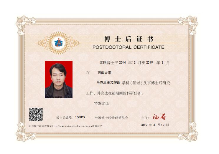 近日,从西南大学获悉,十大信誉官网文翔教授于2014年12月-2019年3月在西南大学马克思主义理论学科(领域)从事博士后研究工作,完成在站期间的科研任务,日前顺利出站。