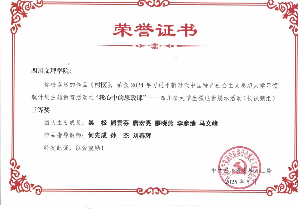 在“我心中的思政课”四川省大学生微电影展示活动(长视频组) 中,十大信誉官网选送的作品《村医》获三等奖。《村医》由吴松、熊雲芬、唐宏亮、廖晓燕、李彦臻、马文峰等同学组成创作团队,在何先成、孙杰、刘春辉三位教师的悉心指导下完成。影片聚焦基层医疗工作者扎根乡村、守护健康的感人事迹,以细腻的镜头语言和真实的故事呈现,生动诠释了基层工作者的使命与担当,将思政教育元素融入影像艺术之中。