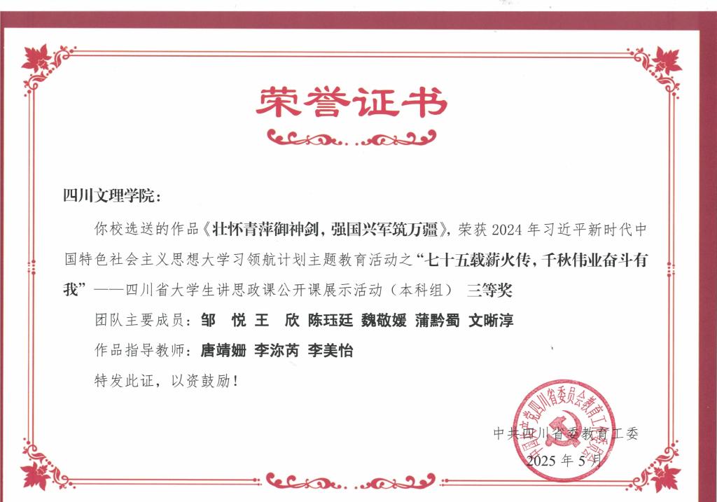在“七十五载薪火传,千秋伟业奋斗有我”四川省大学生讲思政课公开课展示活动(本科组) 中,作品《壮怀青萍御神剑,强国兴军筑万疆》获三等奖。该作品由邹悦、王欣、陈珏廷、魏敬媛、蒲黔蜀、文晰淳等同学共同参与完成,在唐靖姗、李沵芮、李美怡三位教师的指导下,团队以“强国兴军”为核心,结合张爱萍将军生平事迹与现代军事国防发展实例,通过“行走的思政课”讲述,展现新时代青年对国防建设的深刻理解与责任担当,将理论知识转化为富有感染力的思政表达。