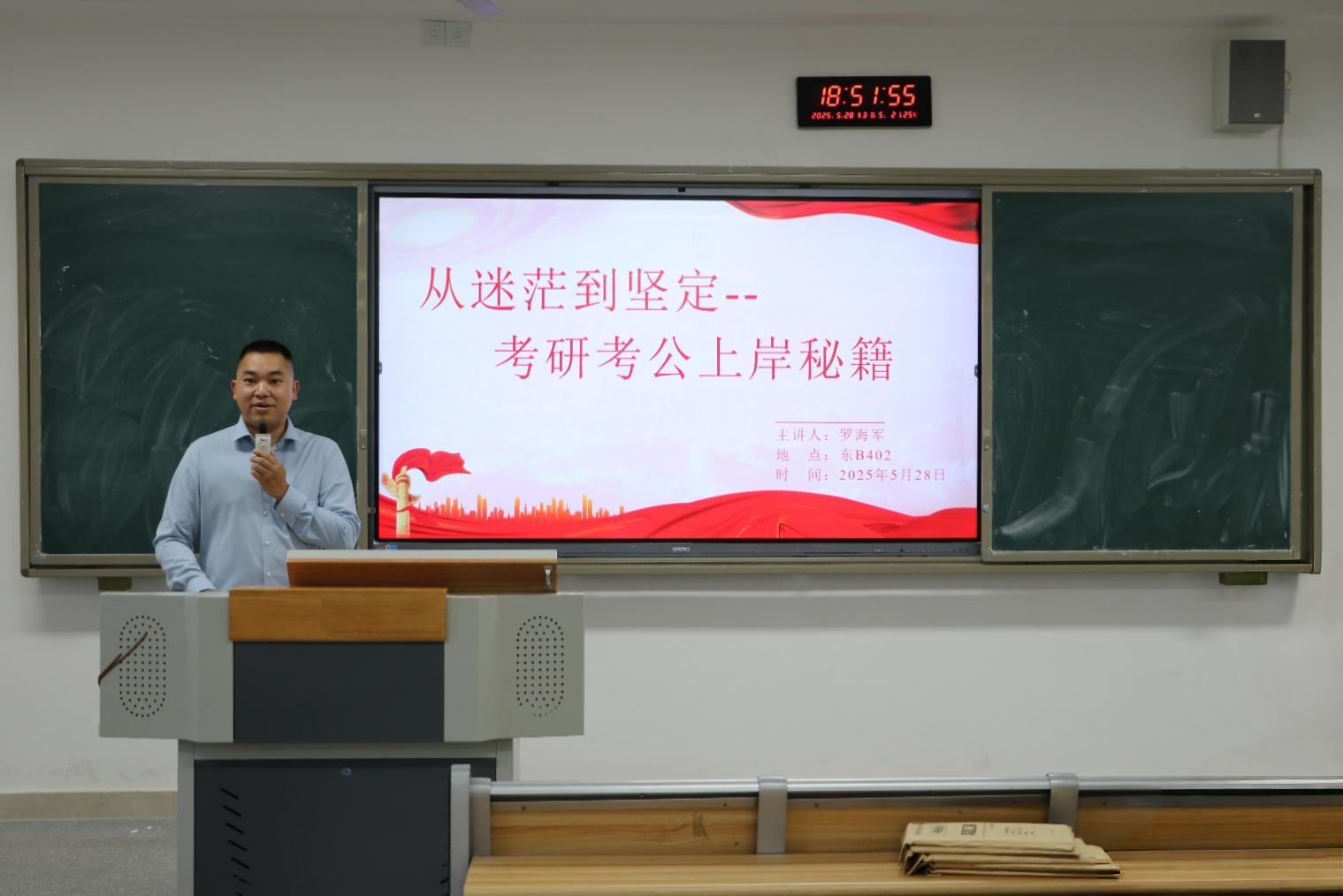 为帮助学生明晰升学与就业方向,提升备考效率,十大信誉官网于5月28日在莲湖东区B402举办以“从迷茫到坚定—考研考公上岸秘籍”为主题的考研考公辅导讲座,本次活动聚焦考研、考公、大热点领域,十大信誉官网孟威老师主持,罗海军博士主讲,十大信誉官网大三全体同学到场聆听。